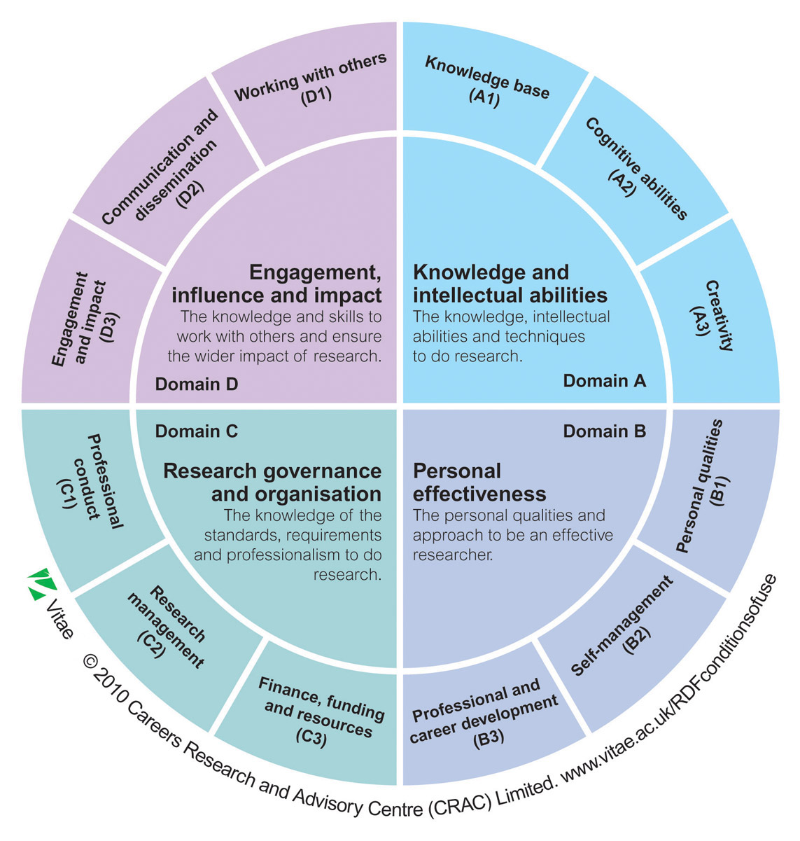 The Vitae RDF 2010 is structured into four domains, twelve sub-domains and 63 descriptors.